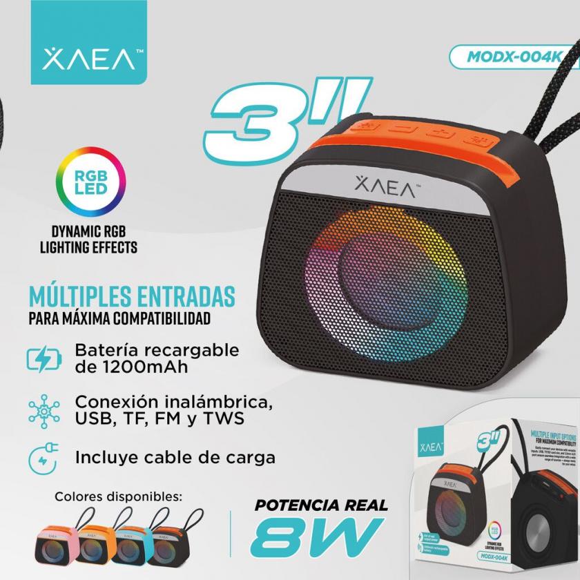 Diseñado con una práctica guía para celular y carga tipo C, su batería de 800mAh a 3,7V garantiza horas de música continua. Con unas medidas de 11,5 x 8,5 x 8,5 cm, es compacto y fácil de transportar. Disponible en colores negro, rojo, azul y verde, incluye cable de carga y manual.
